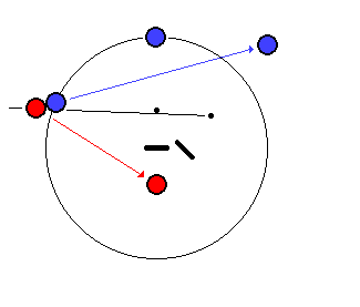 - Umístěte strikerovu kouli proti roquetované kouli tak, aby spojnice středů ukazovala přesně ve směru, kam chcete, aby šla ROQUETOVANÁ koule (nebo těsně "vně" tohoto bodu z důvodu "pullu" jak je uvedeno níže).